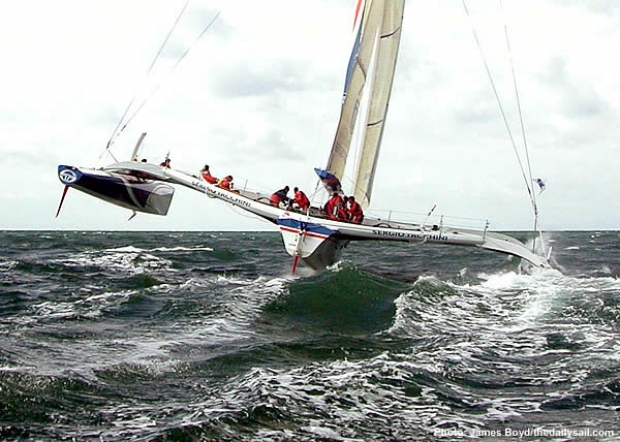 Consistently at the back of the fleet is Philippe Monnet's Sopra Group and dogging their way around the course (relatively) - Yves Parlier's Mediatis Region Aquitaine. Parlier gives the impression that he is going to be returning to the drawing board with his radical catamaran that makes for impressive photographs hidden behind plumbs of spray but that to date has failed to challenge the trimarans on any point of sail.