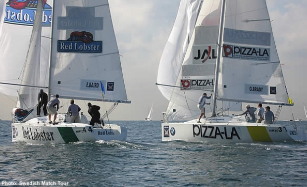 The Pizza-La Red Lobster Nippon Cup, the fourth event of the 2004-’05 Swedish Match Tour, got underway today with six crews sailing five flights and the other six sailing two flights. Due to the disparity in races sailed, there’s a jumbled leaderboard after the first day of the 15th anniversary match-race regatta.