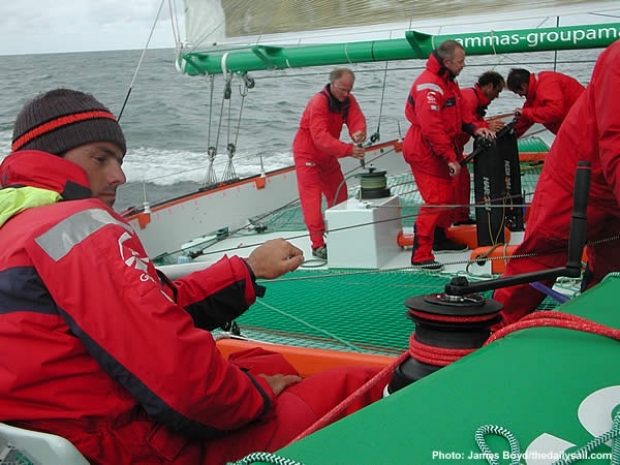 Other members of the crew include Philippe Touet of the Incidences sail loft who handles the sheet for Groupama's magnificent 175sqm inshore mainsail with the world's largest square top outside of the gaffer fleet. Eric Coulon shares grinding duties with Stephane Guilbaud, technical director of the Groupama campaign. America's Cup veteran Benoit Briand is genniker trimmer while Thierry Fouchier, with whom Briand usually sails as part of Bertand Pace's match racing team, is the Solent trimmer. This leaves Ewen Le Clec'h, part of Groupama's shore crew, in charge of the elegantly named 'piano' - the impressive array of Spinlock-ware for the huge number of lines coming aft from the mast and foredeck - a job equating to that of a pitman on normal race boats. Last but not least is the familiar face of Franco-South African round the world veteran ( Silk Cut, Tyco, Club Med) Jan Dekker dealing with the bow. Again another very different job this boat having just five headsails, including two gennikers in her Grand Prix wardrobe - and all of them on furlers.