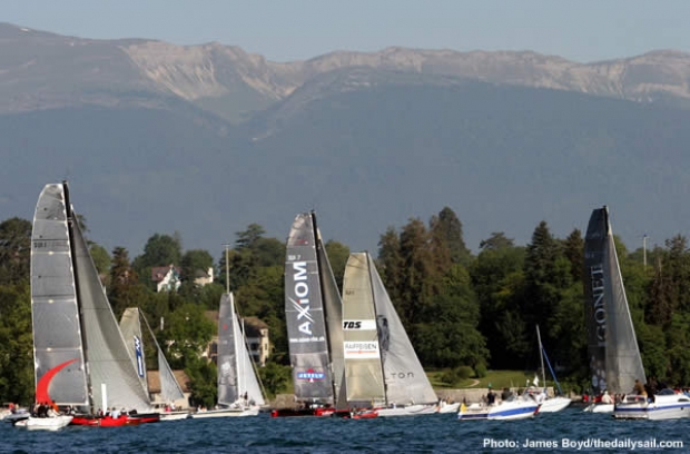 While the multihulls made their way slowly across to the north shore of Lake Geneva on starboard tack, so the larger monohulls in the middle of the start line inched their way on port tack towards the opposite ‘French’ shore. With less than 3 knots of wind, it was yacht racing in slow motion. They crossed ahead of the densely packed and flailing smaller monohull classes starting from the southern end of the line, heading for the shoreline crowds of spectators.