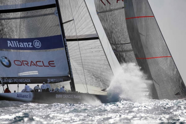 United Internet Team Germany and Emirates Team New Zealand engaged in an aggressive pre-start, but as the gun fired both boats launched out of the blocks absolutely neck and neck. With a drag race out to the left-hand side, the Kiwis imposed their superior boatspeed to take control of the Germans. However Jesper Bank's crew sailed a tidy race in tough conditions.