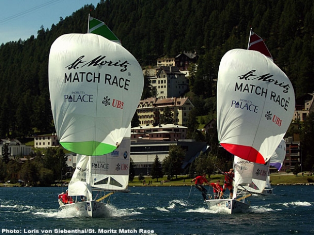 Group A took to Lake St. Moritz for racing shortly after midday, but could only complete its pre-round fleet race. The wind died away afterwards and as the time approached 3:00 pm the race committee postponed the seven crews for the day. That put Group B on the water and the local Maloja wind filled to provide the energy to get the boats around the course. The Maloja, a southwesterly wind that funnels up the Maloja Pass from Italy, started around 6 or 8 knots and built to nearly 15 knots late in the day.