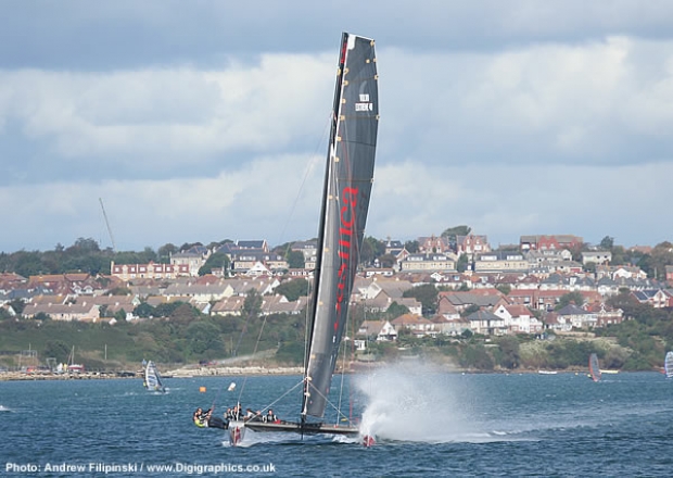 I should probably explain this gushing introduction: It was written about 30 minutes after stepping off Basilica, the VX40 catamaran, down in Weymouth last week for Weymouth Speed Week. Often we at TheDailySail.com receive invitations to go and do fun or interesting things and there can be a bit of a scrap about who gets to go. So when we received a request from the Basilica team to come sailing with them during this event there were the usual arguments about who got to go. However, upon further inspection it became clear the team were attaching four trapezes to the boat and wanted to break to 36 knot Weymouth Harbour speed record; this was suddenly a very different story. Quickly, I discovered all eyes trained on me! As youngest with most trapeze experience and, presumably, most expendable it was decided I would go and hang of the side of this machine for two days.