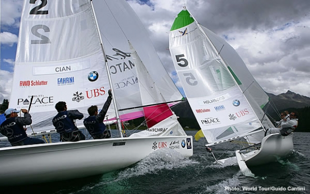 Mark Mendelblatt and Paolo Cian have a mission: to eliminate Alinghi helmsmen at the 4th annual St. Moritz Match Race, Stage 3 of the 2006-’07 World Match Racing Tour. They’re one win away from mission accomplished. Mendelblatt leads current nemesis and former coach Ed Baird 1-0 in their semifinal match, and Cian leads former idol Jochen Schuemann by the same score in the other. The winner of each match will be the first to 2 points.