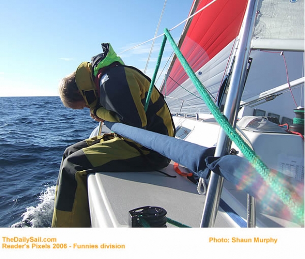 SM: This Photo was taken on the way to La Rochelle (450 mile RORC Race) in August. Not much sleep was had and as Ric was about to go down below, a voice said (you can work that out only two of us on board) if your going to sleep it might as well be on the rail, so he did.