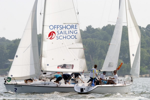Mother Nature smiled on Manhasset Bay today with great wind and even a few white caps. Racing was fast and competitive, with many protests flags evident as teams pushed their boats and their teams to the limit. Two crew fell overboard, one while screaming to the finish under spinnaker; the other during practice before their start. According to Swinton, there was “good wind, but very shifty.” Welcome to Manhasset Bay, a venue that has felled many a top ranked match racer. What makes Loe and Swinton’s position on the leader board so interesting is that they are first timers to the Cup, competing against teams that have raced two, three and more times here in western Long Island Sound. So much for the “knowledge of local waters” advantage.