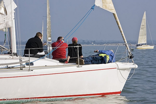 A gentle zephyr was all that was available when racing was due to begin at 10.00, but it turned out to be the best the morning had to offer, and by 11.30 it had dropped to nothing. The inevitable result was the raising of "AP over A", which was the signal for the huge fleet to return reluctantly to the Hamble.