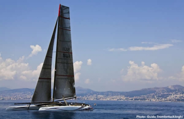The 33rd America's Cup Defender transported its giant catamaran, the first step in the development process towards the America's Cup Match in February 2010, by helicopter from its base on Lake Geneva to the north Mediterranean port on 7 August. Training will continue in Genoa before the boat is transported to the 33rd America's Cup Venue in Ras al-Khaimah, UAE.