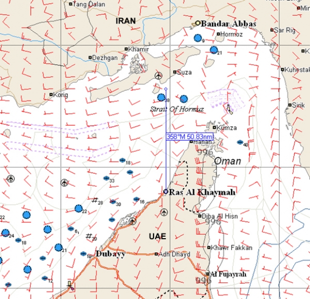 While there was much joking a while back about Alinghi holding a Deed of Gift America’s Cup in somewhere inaccessible to a US team such as Cuba or Iraq or North Korea, Ras Al Khaymah is located just a short 50 mile boat trip across the Strait of Hormuz from Iran. And this brings us to an interesting aside. A Deed of Gift series of match races isn’t designed to fill a modern TV schedule with a couple of laps around a short course and back at the dock in time for the next ad break. With a Deed of Gift match races one and three (if required) are windward-leewards with a 20 mile beat, while race two is a 39 mile equilateral triangle (ie 13 mile beat). So if it is blowing from the north and the PRO is getting active in moving the whole show offshore to ‘find wind’, the weather mark on races one and three could be within spitting distance of Iranian territorial waters!