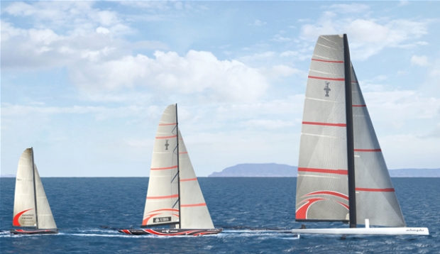 Alinghi's new big multihull for the 33rd America's Cup is set to be launched in mid-July we understand, although of course no further details about their new weapon are available at present. In the meantime Alinghi have released a graphic representation showing how their new beast will compare size-wise with their D35 catamarans and a V5 Cup boat. The side profile doesn't reveal too much about the design, but the positioning of the beam attachments to the floats indicates as many have suspected - that it is indeed a catamaran. Judging from the scale the cat is also 90ft and not a 115ft twin master. Of course this may all be a red herring and we'll find out that the Swiss team will be defending in a 90ft long foiling Moth.