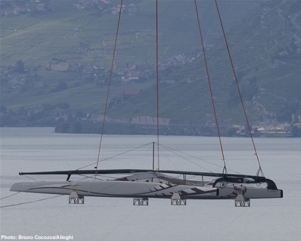 Alinghi 5, the Swiss America's Cup Defender's new catamaran, was lifted out of the tent where it was built in Villeneuve, Switzerland, and into the air by a Mil Mi-26 helicopter, the biggest and most powerful in the world, to be launched on Lake Geneva.