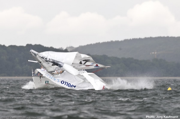 The final matches where even harder with lead change after lead change in all races with the breeze now gusting up to 30 knots. At the 4 minute signal just when Adam Minoprio’s crew was entering the start box suddenly the mast came crashing down.