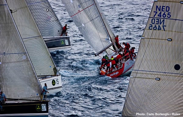 For the smaller yachts of the fleet, the first short beat was uneventful; although the Swan 45 start line was not, certainly at the committee boat end. On Nemo, Andy Green and helm Ken McCullough - substituting for owner Bernard Lambilliotte whose arrival on the island had been delayed by the weather and business commitments - looked pretty good at one point and appeared close to shutting the door at that end. But leave Vasco Vascotto an inch and he has the confidence to make it look like a mile as he calmly sailed in front of the line up, hardening up to perfection and promptly leaving the rest of the nineteen boat division choking in his wake.