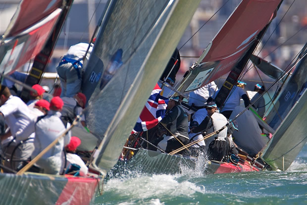 Britain’s Ben Ainslie seized the start of this sudden death match with flair and defended his lead through the first half of the race and multiple protests only to hand the lead to Paul Cayard’s Artemis on the second weather leg. The Swedish boat made the most of its advantaged starboard entry and pushed TeamOrigin below the port layline before the start. Hutchinson, steering Artemis, reported massive shifts in the 16-knot southerly and Ainslie would ride a big leftie into the lead. Pushed outside the left side of the line in the remaining pre-start seconds, he tacked onto port on a big shift and skinned across the bow of the starboard tack Swedish boat right after the gun. The umpires green-flagged the encounter but Hutchinson saw it differently. “Our bowman was saying, “We’re going to hit him! But that’s the game.”