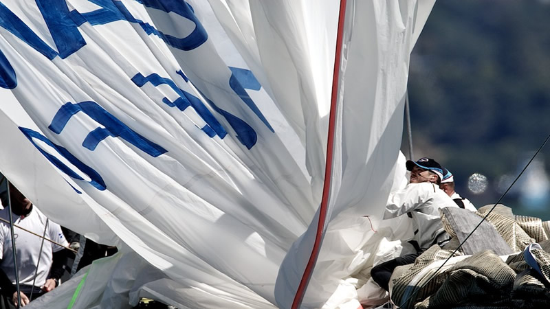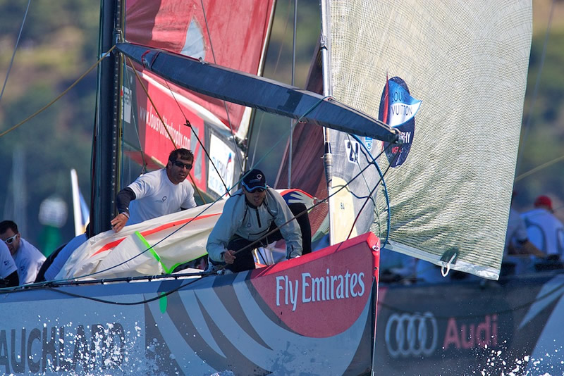 A minute later TeamOrigin led by a boat length. Ainslie came back on starboard with a small lead and tacked inches to leeward of the approaching Artemis, who again appealed to the umpires, but to no avail. A big shift on the left kept Artemis in the game and she was only one and half boatlengths behind at the top mark, and trailing by only seven seconds through the leeward gate. It was Ainslie’s race until several tacks into the leg he let Hutchinson get to the right in the oscillating shifts, with 400 metres separation. When they converged again, Artemis led by 46 metres. Artemis extended on the run with a damaged spinnaker and the foot tape reinforcing fluttering in the breeze. “What a brilliant job from all our crew, getting back into the race,” said Hutchinson. “In hindsight, we didn’t do it right up the second beat,” conceded Mike Sanderson, who handles the runners on board. “But you know, we need to make sure we don’t kill the tiger as well. We have amazing talent at looking up the course and picking up shifts, and if we kill the tiger, we are going to be an ordinary talent.”