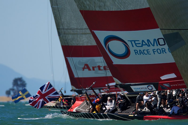 Following the entry the pair dialled up and held head to wind for some time. The TeamOrigin afterguard had become aware of a significant port end bias on the line and in a highly unorthodox end to the pre-start both boats found themselves outside of the layline to the pin end, TeamOrigin squeezed out. To weather, Artemis tacked away, tacking back on to starboard just before crossing the line. Meanwhile unable to lay the pin TeamOrigin had tacked back on to port and, incredibly, thanks to good pace, the favoured pin and the Swedes' double tack, the Brits just managed to squeeze across the bow of Artemis shortly after crossing the start line - a very ballsey move by Ainslie and the first time we have seen a port tacker win the start of a match race. Artemis protested, but the umpires found in the Brits’ favour.