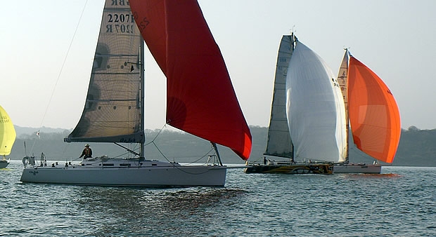 The 7am start at Gurnard was down tide with the predicted 7 knots easterly, the fleet setting port pole spinnakers. A few struggled with assymetrics as winds lighted further and Simon Curwen on Voador then led a few onto starboard gybe away from the island towards the middle channel.
