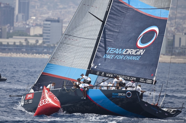 Today it was TeamOrigin which got the early jump, after another sharp start from the British crew who were able to get to the favoured right, inshore side early along with Bribón. The Spanish boat lost a little on the first run when TeamOrigin gybed off earlier into a favourable shift, but Bribón were in touch until the second beat when the clew-patch on their new headsail gave way and they were forced to quickly hoist a replacement.