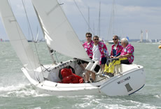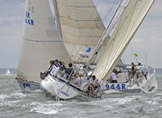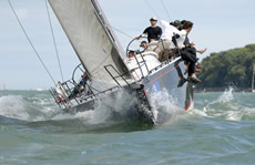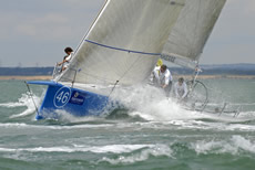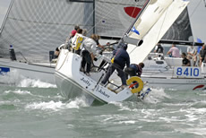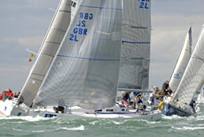 Yesterday one third of the Sonar fleet was OCS, which led to a rather more timid approach from some crews today, allowing Simon Barter's Bertie to lead away from the start, after hitting the line at speed in a perfectly timed manoeuvre. Like Julia Bailey he stayed a little out from the shore, which again paid off and Bertie's lead extended a length or two on each tack in the initial stages of the race. As with other classes, there were many close port/starboard situations as the boats short-tacked past the Green and towards Gurnard, with the occasional dull thud indicating a minor collision.
