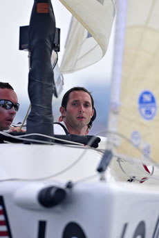 Bolzan once again went for the early gybe but almost immediately sailed into a wind hole and had to gybe straight back. This gave Melleby and Bressani the opportunity to sail on for a while before gybing in clearer air and eventually both cross ahead of Bolzan at the mid-point of the run. The wind by this stage had dropped away again and Melleby and Bressani had to use all their light airs guile to pick their way downwind to the finish. Melleby took the win and Bressani rounded out an impressive day in second to take the overall lead at the end of day one. Corinthian Jahre followed Bolzan home to take fourth in that race and secure an impressive second overall. Second in the first race, Fracassoli could only mange seventh in this race, but this was good enough to see him sit in third overall tonight.