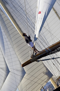 Hallowe’en was launched in 1926 and was a new type of design for Fife, sort of a cruising version of the successful 15-Metre class, which included Tuiga and Lady Ann. With her original rig, Hallowe’en was – and in fact still is – a powerful boat: shortly after her launch, she won the Fastnet Race and set a course record of 93 hrs, 13 mins (with the start/finish off Cowes).