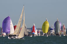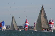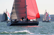 While Saturday produced tough racing for the J/109, J/80, and Laser SB3 classes in 10-20 knots of cool breeze, Sunday was a softer day, with sunshine and blue skies, but still with big wind shifts. The Black Group start was set up on the Ryde Bank with a long first beat across the ebbing tide to windward marks near the mainland shore. With two races scheduled and the prospect of a softening breeze, the second start sequence was underway by midday on the same startline. Although the classes starting later struggled in the now east-going tide all boats were finished by 1430.