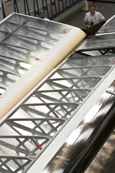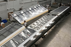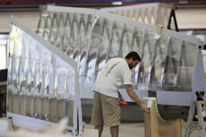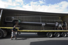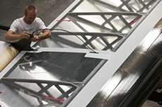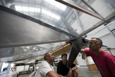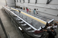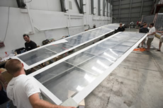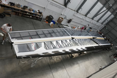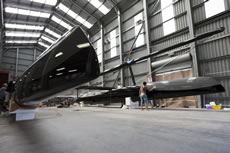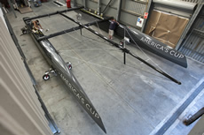 Assembly of the first AC45 America's Cup one design catamaran continued today with assembly of the 300kg 20m tall solid wing sail in situ in the former Emirates Team New Zealand base at the Viaduct Basin.