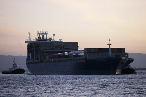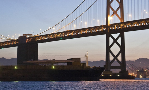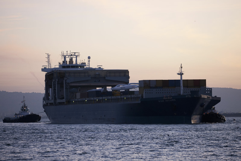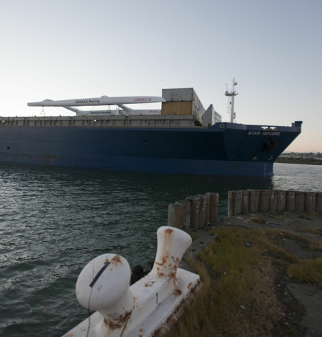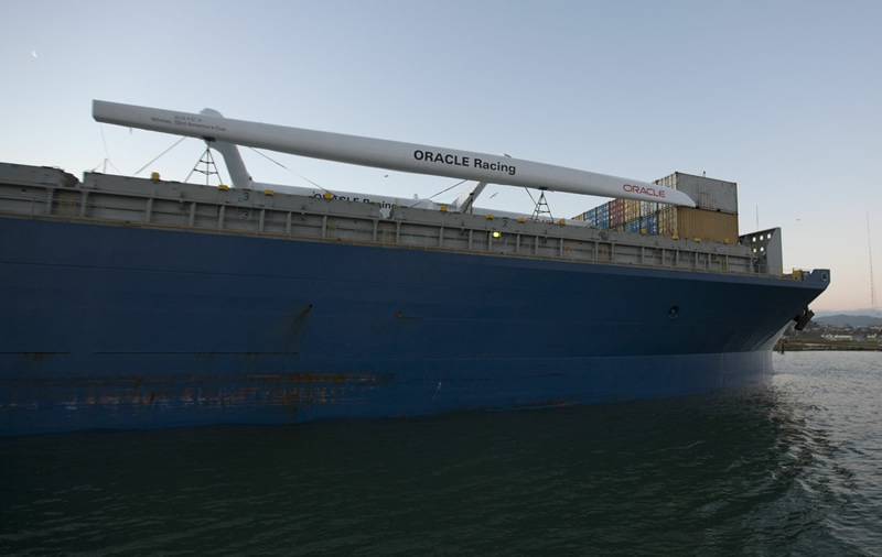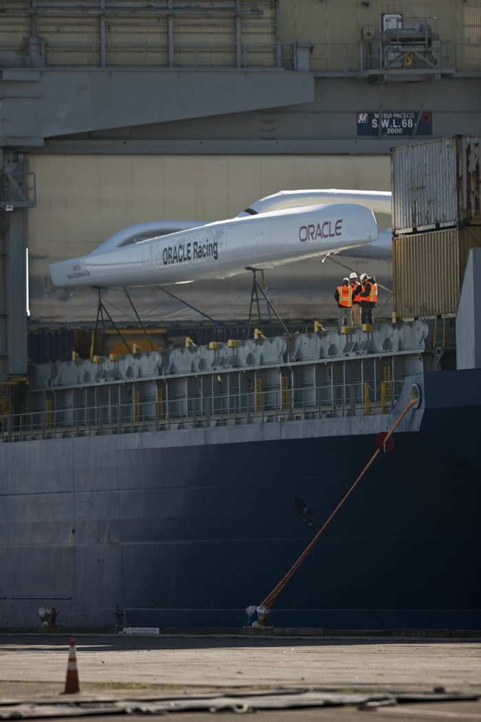 The giant America’s Cup-winning trimaran arrived in the Bay today aboard the freighter M.V. Star Isfjord after a 7,900-mile passage from Valencia, Spain, via the Panama Canal.