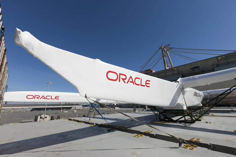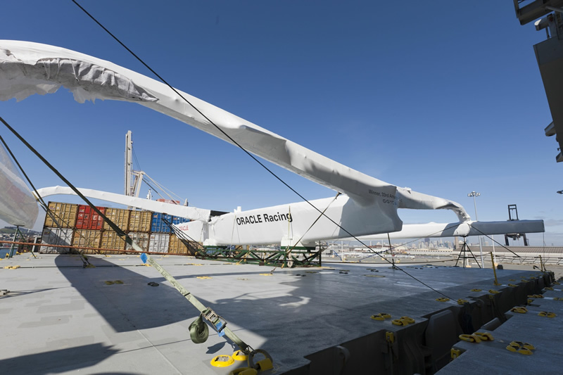The timing of unloading the game-changing 115ft long trimaran and its wingsail will be determined by prevailing wind conditions. Both will be placed in short term storage in Oracle Racing’s new base on Pier 80. Longer term, there are plans to put the yacht and her impressive 223-foot wingsail on public display.