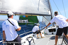 The Franco-German crew of Audi Sailing Team Powered by ALL4ONE, led by Jochen Schuemann (GER), won the day’s first race after their start from pin, left end of the start line and were able to lead for most of the race, finishing just three seconds ahead of Bribon.