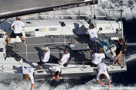 It proved an especially testing day for the current World Champions and circuit leaders Quantum Racing (USA) who seemed to struggle at times for pace in the awkward swell and made some small tactical errors which cost them, finishing 6,4,7 for the day, to spend a lot of their Audi MedCup Circuit lead, their weighty average for the day contrasting with that of their main title rivals Container who finished five boats ahead of them in the final race today.