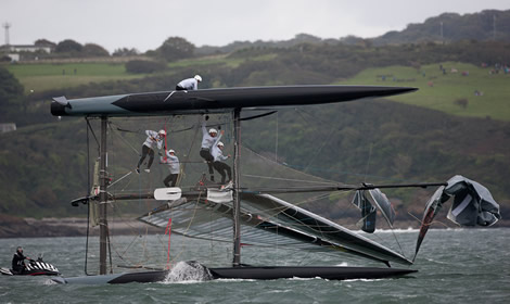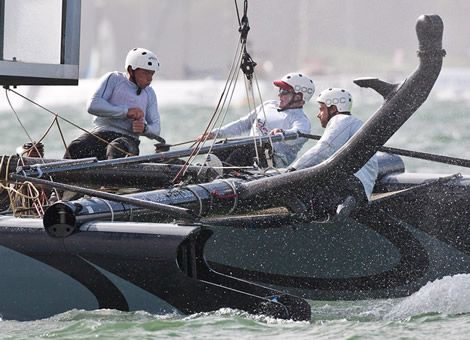It seems that on the AC45s it is mainly the helmsman who does the tactics with input from tactician, whenever the opportunity arises. “It is more a tactics/strategy mix rather than straight tactics, because you are quite head down with the boat handling,” says Percy. “It is more a case of taking time every 20 seconds to check we are on the right shift and where the next line of pressure is and giving Terry a second option. You can see that the helmsman has the most time, but I certainly have time to get my head up, particularly upwind. Downwind is more getting ready for the gybe and laylines. So there is a lot going on. The fact that I am quite busy means you have to play it a bit more like small boat match racing. But it is interesting, a new challenge. We have all got a lot to learn.”