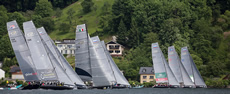 Lake Traunsee, Austria threw everything at the RC44 fleet today for the first day of fleet racing at the RC44 Austria Cup. The day started with a glassy lake that delayed proceedings. A light westerly breeze emerged and the 12 competing boats were sent afloat, only for the breeze to shut off just as the fleet arrived. After a drift in the sun the skies suddenly darkened and 25 knots of breeze filled the lake with white horses.