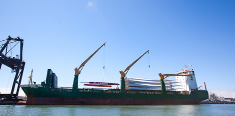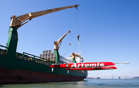 The AC72 left the Mediterranean, crossed the Atlantic Ocean and traveled through the Panama Canal to the Pacific Ocean to arrive at Pier 80 before being towed across to the team’s base in Alameda.