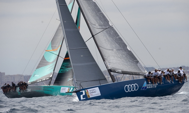 After three races off Valencia in brisk winds and an awkward chop Audi Azzurra Sailing Team lead the Audi Valencia Cup, the final event of the 2012 52 Super Series.The team from the Yacht Club Costa Smeralda won both of the first two races and led the third. But when a big gust and wind shift struck just in the final metres of the day’s final race, the kite of Audi Azzurra Sailing Team touched the committee boat’s antenna. Having to drop their gennaker and take their penalty turns before finishing properly, the team which is skippered by Guillermo Parada, dropped to a fifth place finish.
