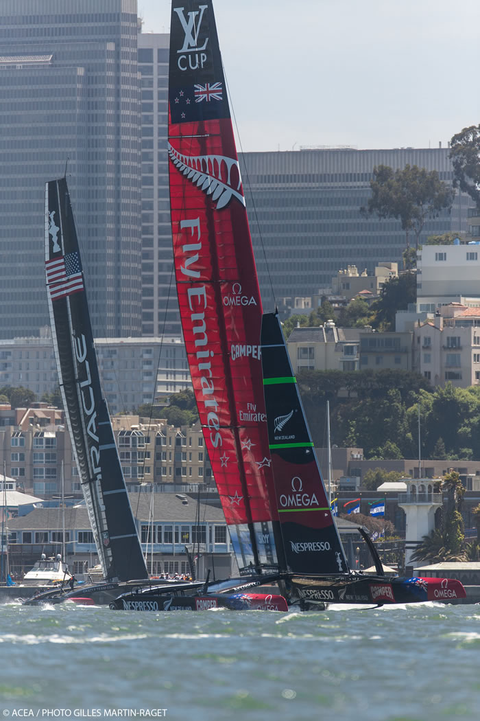 The stability of the ride is a vital part of the boat speed equation on the AC72s and an area where the Kiwis appear to have the upper hand. As proved time and again in the Louis Vuitton Cup, Luna Rossa would lose boatlengths whenever she ‘touched down’, while the Kiwis showed their usual meticulous skill in remaining airborne. This ability is obviously important both in a straight line, but particularly when turning corners – hence mastery of the foiling gybe has been important. Again let us remind ourselves what an accomplishment this represents – a 7 tonne catamaran foiling through a gybe... 10 years ago pioneering sailors were struggling to carry out foiling gybes successfully on their 30kg Moths...