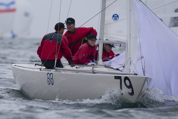 Bill Hardesty’s resilience has brought him and his crew of Taylor Canfield, Stephanie Roble and Marcus Eagan to the top of the leaderboard despite a heavy downpour and fluky winds on the third day of the 2014 Etchells Worlds, hosted by the New York Yacht Club at Harbour Court in association with Sail Newport.