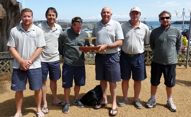 And finally we came to the most important presentation of all, The Half Ton Spirit Trophy, which is awarded to the team, which, in the opinion of the Class and the Regatta Committee, truly embodies the extraordinary spirit of the class and the event. For their commitment and incredible personal hard work in keeping their beautiful boat in 100% as original condition, for sailing with great success with an entirely Corinthian crew and for racing her, runners, checkstays, titanium fittings and all, to an incredible ninth place overall, the 2014 Half Ton Spirit Trophy was awarded to deafening applause to Concorde (1989 Andrieu) owned by Francis Marshall and crewed by Robert Libby, Matt and Ivan Jacock, Peter Greenwood, Dick Jackman and Jack Spree - a bunch of Enterprise sailors and fishermen from Loo in Cornwall. A very moved Francis and his entire team came to the podium to accept the trophy and the recognition of their fellow sailors.