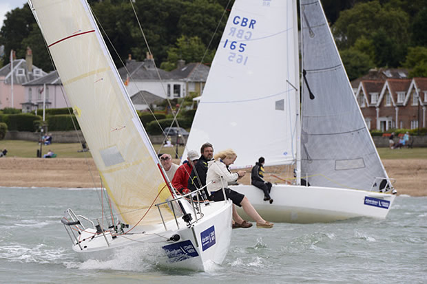 Peter Eddis’ Scarab 2 was the first boat to tack near the beach, while Sarah Everitt and Steve Warren-Smith’s Aquabat also tacked early further offshore. However, it was Malcolm Hutchings and Andy Ramsey’s Lady Penelope, last year’s overall Aberdeen Asset Management Cowes Week winners, that took an early lead.