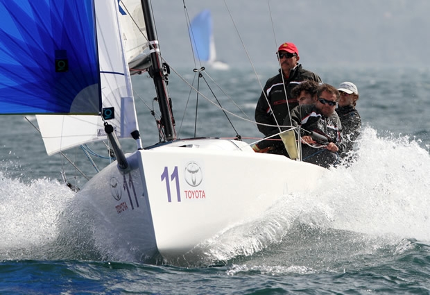Carlo Alberini on Calvi Network strengthens his lead with an 11 point advantage J/70 European Championship. The former European 420 Junior Champion and current National champion on the Olympic 470, Simon Sivitz Kosuta, has been forced to pull out of the competition after suffering serious damage to his boat.
