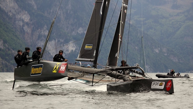 Despite there being tricky conditions and some rain showers, six races took place on day two of the Alps Challenge Traunsee for the foiling GC32 catamarans.