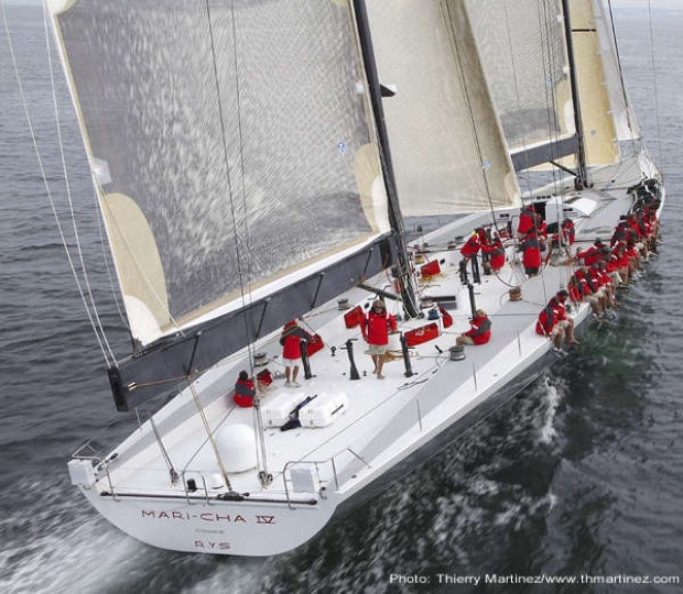 Mari Cha IV put into Bermuda shortly after Hurricane Fabian had devastated it and they sailed on to Newport with only a crew of eight! Skipper Jef d'Etiveaud recounted what proved to be a rather swift delivery: "We brought the boat from Bermuda to Newport in less than two days averaging 20 knots - the last 18 hours in 20 to 30 kts of wind... and all that with all-manual winches and two person watches!"