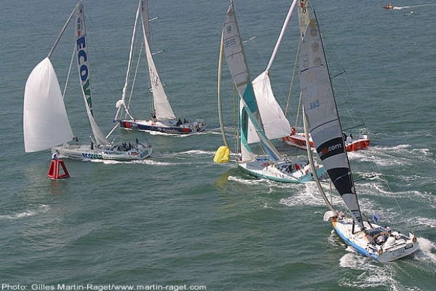 Around Alone winner Bernard Stamm on Bobst Group-Armor Lux got off to the best start, crossing the line around three seconds after the gun, narrowly ahead of Mike Golding on Ecover. There was a small amount of argie-bargie on the start line when Vincent Riou's all orange PRB who had hoisted their kite first squeezed into the small gap between Stamm's 60 and Mike Golding's Ecover. PRB's kite touched the starboard deck spreader on Ecover resulting in a protest from the British boat.