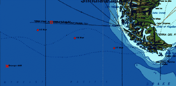 Position at 05050GMT: 55deg 05.255S 76deg 27.549W