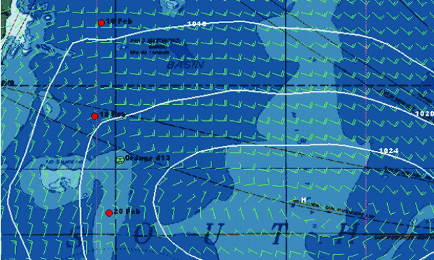 The weather ahead of the 125ft catamaran continues to look volatile but their timing seems good and while they may experience light conditions today the forecast charts show the South Atlantic high slowly receeding to the east over the weekend. Tonight the crew of Cheyenne will get their first taste of the westerlies of the Southern Ocean at around 36degS.