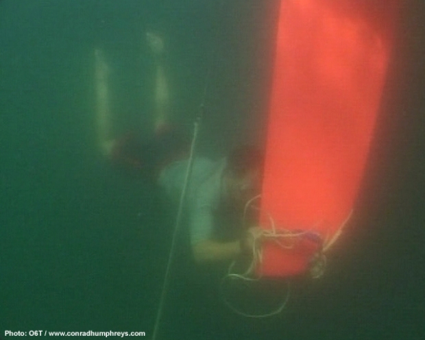 "So I had to grab my spare air - I know I have about 10 minutes in a little air canister and hoped that if I followed the line down that I could still catch it before it drifted off. I am an inexperienced diver, but I was pretty nervous about swimming down 13m 45ft with just a small canister of air and no weight belt to control my ascent. But I had no choice, so I disappeared. Luckily I found the weight and the line was just - there was literally 1ft left through the pulley block - I grabbed the loose tail and swam back up to the surface using the line to control my ascent. I got to within 1m of the surface and the line went tight and I realised that the boat had drifted off and pulled the other end tight so I couldn’t get above the surface of the water. I don’t know how much air I had left, but just waited hoping for the boat to drift back the other way and eventually it did and it allowed me to break the surface and quickly get tie the dead end on to the back of the boat. So that was pretty nerve wracking, but I had recovered the kit.