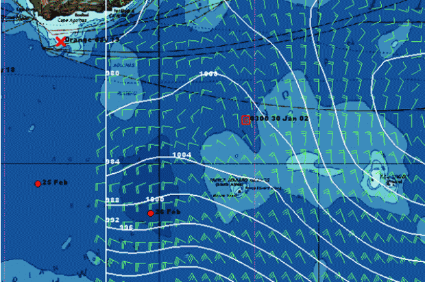 Steve Fossett and the crew of Cheyenne continue to forge south and are now beyond 48degS. Although it is of course advantageous to sail as far south as you dare in the Southern Ocean to reduce the number of miles sailed, Fossett and navigator Adrienne Cahalan in cohoots with their meteorologists at Commander's Weather in the States have also been forced into this situation. At present there is a high pressure system centred over 40degS 35E and if they were to sail any further north they would land in its clutches.