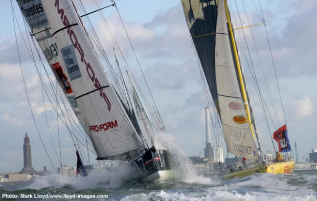 At the end of 20 minutes of upwind sailing on the race course, a group of six Open 60s opted for one reef in the mainsail and staysail combination, and took about 500 metres out of those who preferred to keep the Solent up. In this leading group, tightly packed together, the race favourites emerged in this order around the Metzinger marker buoy : Mike Golding and Dominique Wavre on Ecover, Roland Jourdain and Ellen MacArthur on Sill et Veolia, Jean-Pierre Dick and Loïck Peyron on Virbac-Paprec, Jean Le Cam and Kito de Pavant on Bonduelle. Brian Thompson and Will Oxley on Skandia, as well as Marc Thiercelin and Eric Drouglazet on Pro-Form. Sailing upwind, boat speed for the Open 60s was around 12 knots, quite impressive considering the uncomfortable seas. Under a steel grey sky, these colourful wings cut a contrasting picture against the dramatic cliffs off Le Havre.