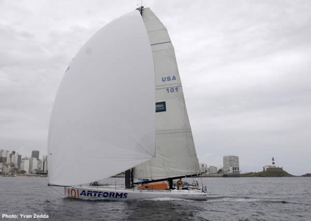 Brazilian home team of Walter Antunes and Raphael Coldefy finished 11th in the Open 60 fleet after crossing the line at 1517 local time (18:17:31 GMT) just after the second and third Open 50 monohull arrivals. They covered the course in 20 days, 4 hours, 17 minutes and 31 seconds at an average boat speed of 8.96 knots, arriving 6 days and 18 hours after the winners. Their new Lavranos designed Open 60 Galileo had to make a three day pitstop into Vigo, Spain, to repair their goose-neck, which broke in the Bay of Biscay storm. After deciding to rejoin the race and rally home, the NE Trades were not as well established for them as for their competitors ahead and so their voyage was frustratingly elongated.