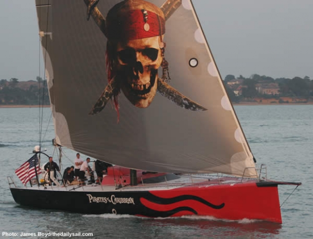 And what of the boat herself? Last week we expressed our concerns over what we felt was an unimaginative paintjob for a boat linked to Disney, a company renowned for creating the fantastic. To be called The Black Pearl (the VO70 does have 'Isla de Muerta' on its transom as port of registry) one would anticipate the boat to have black sails - clever use of graphics could even make them look like tattered black sails - and a wave-ravaged black hull showing cannons pointing out. What is depicted on the hull we have since learned are not hot rod flames, but the black tentacles of a character we can expect to encounter in the second Pirates film - the Kraken - hence the 'eye' that appears on the topsides beneath the 'C' in Caribbean.